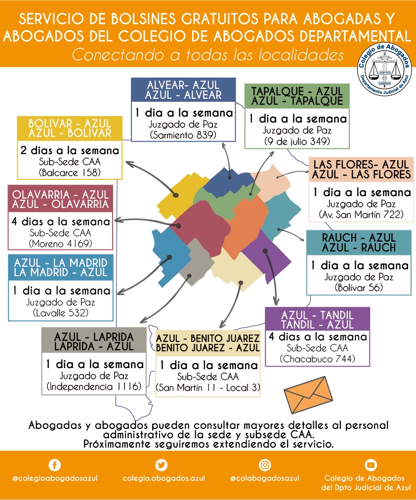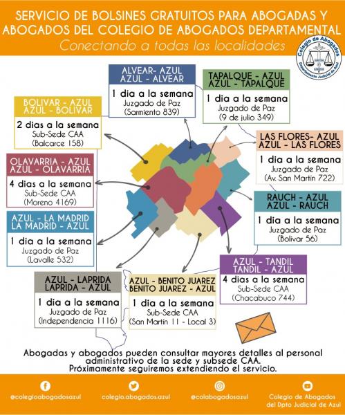 - Azul: desde la sede Av. Perón 514 al Juzgado de Paz de Laprida (Independencia 1116); al Juzgado de Paz de General La Madrid (Lavalle 532); al Juzgado de Paz de General Alvear (Sarmiento 839); al Juzgado de Paz de Tapalqué (9 de julio 349) y al Juzgado de Rauch (Bolívar 56).