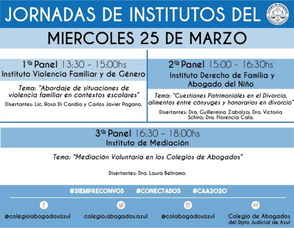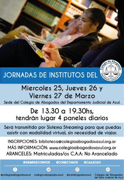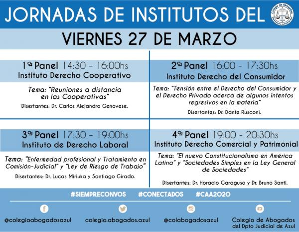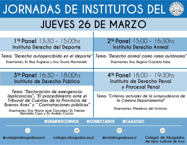 El miércoles 25, jueves 26 y viernes 27/03 se llevará a cabo este espacio de capacitación e intercambio con las últimas novedades en las diferentes especializaciones del derecho, a través de diferentes paneles organizados por los Institutos del CAA. Se trasmitirá por sistema streaming para que abogadas y abogados puedan asistir en forma virtual, desde todas las localidades del Departamento Judicial-.