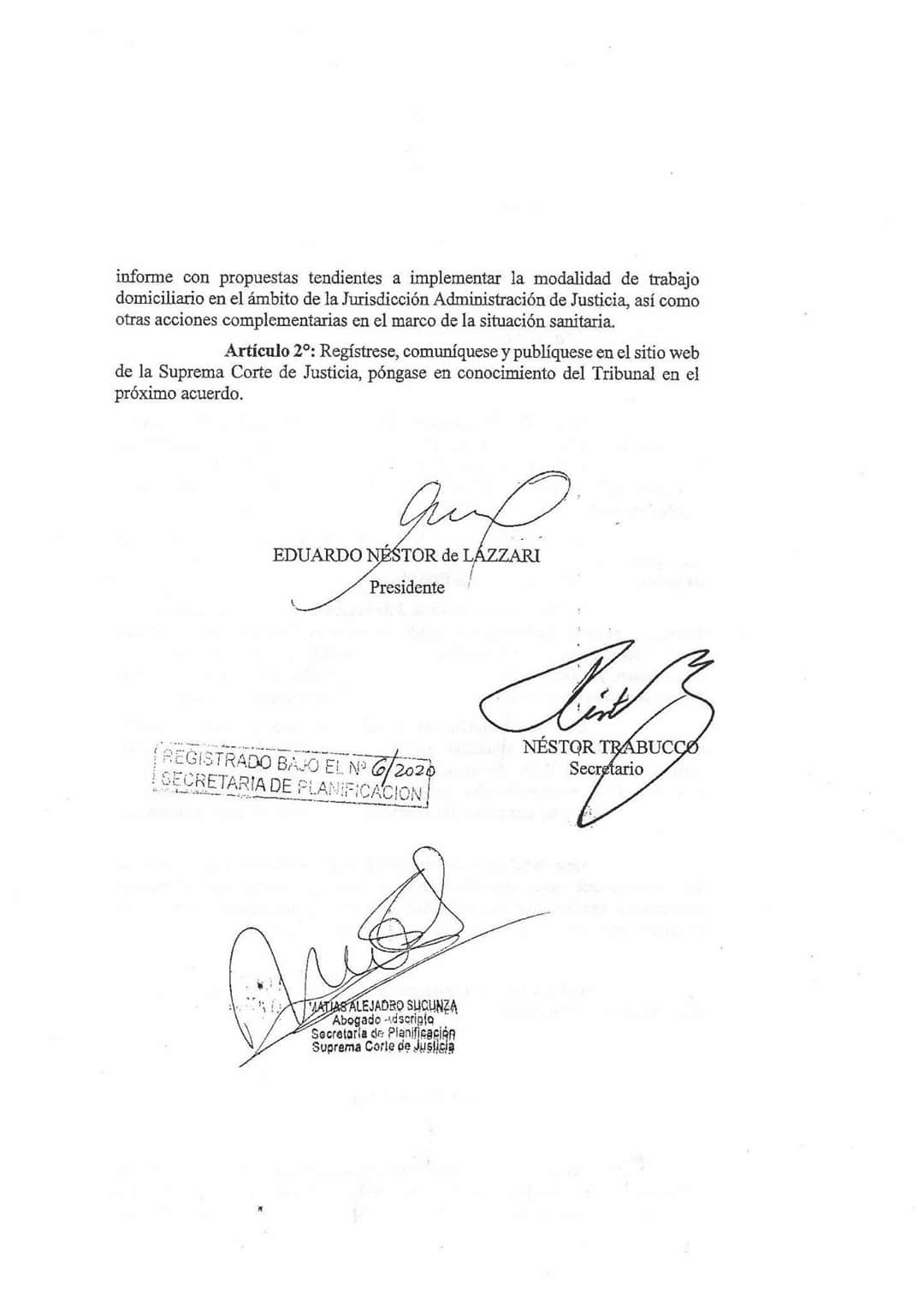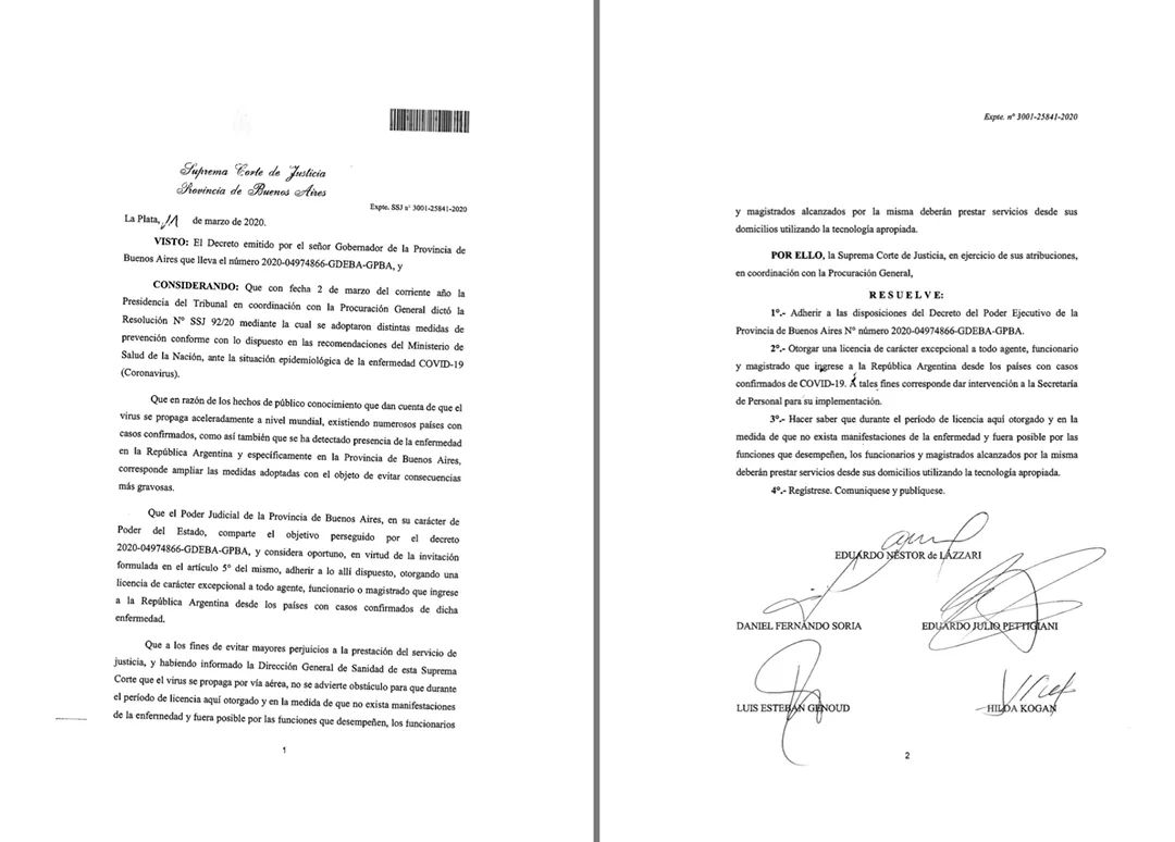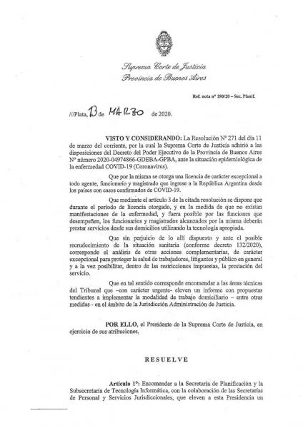 Así a consecuencia de la mencionada solicitud la Presidencia de la Suprema Corte de Justicia dispuso - Res. 123-20- que todos los órganos jurisdiccionales y dependencias de la propia Corte contemplen los requerimientos de los profesionales que planteen problemas para el normal desarrollo de su actividad, extremo que deberá ser previamente convalidado por el Colegio Profesional y ser elevado a conocimiento de la Presidencia de la Suprema Corte a través de la Secretaría de Servicios Jurisdiccionales.