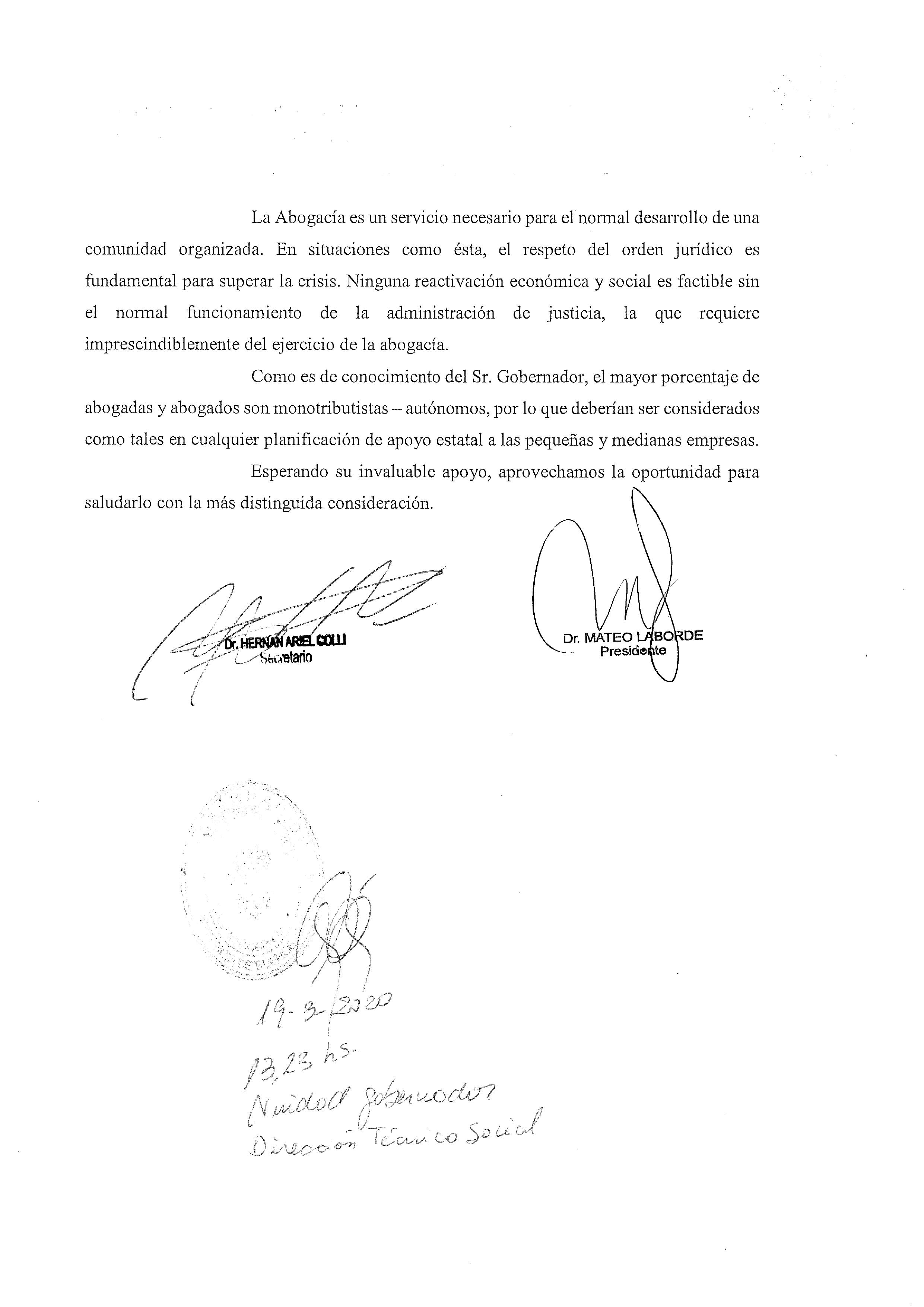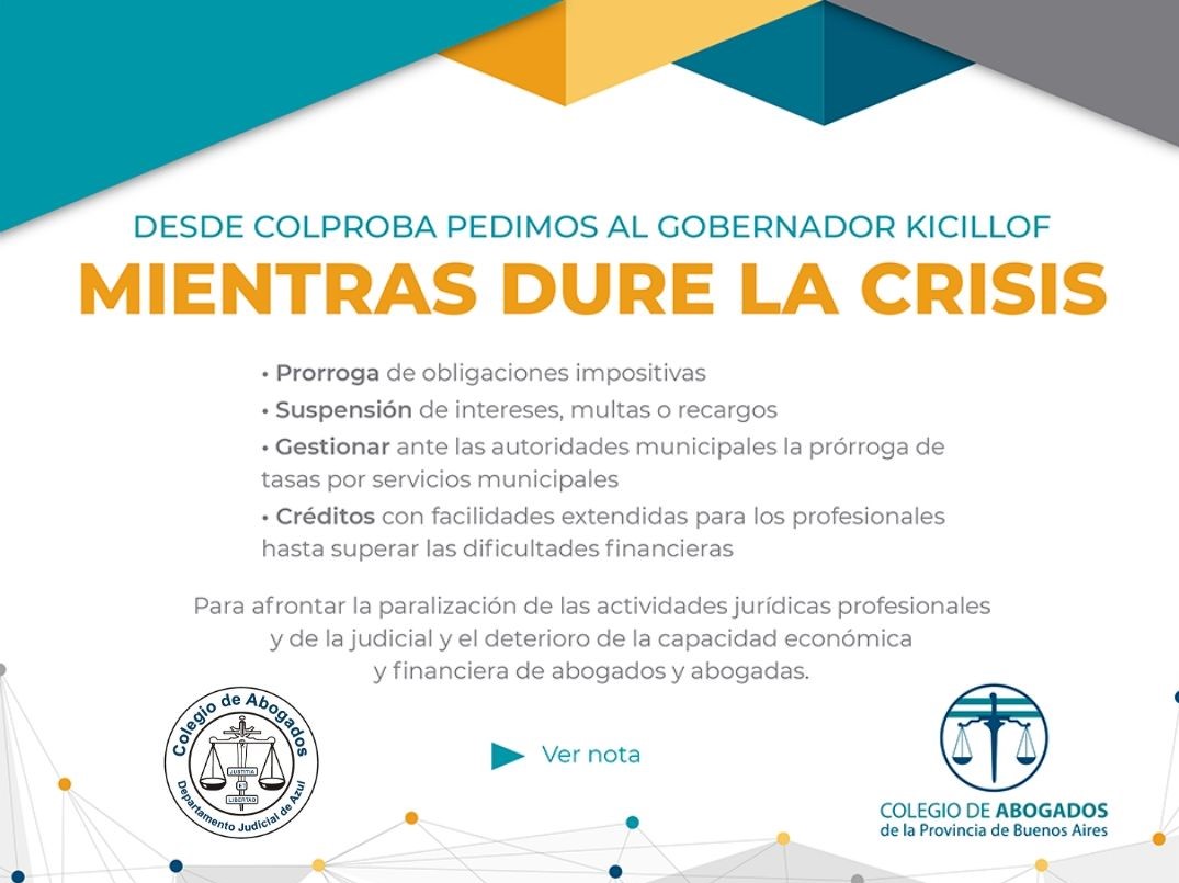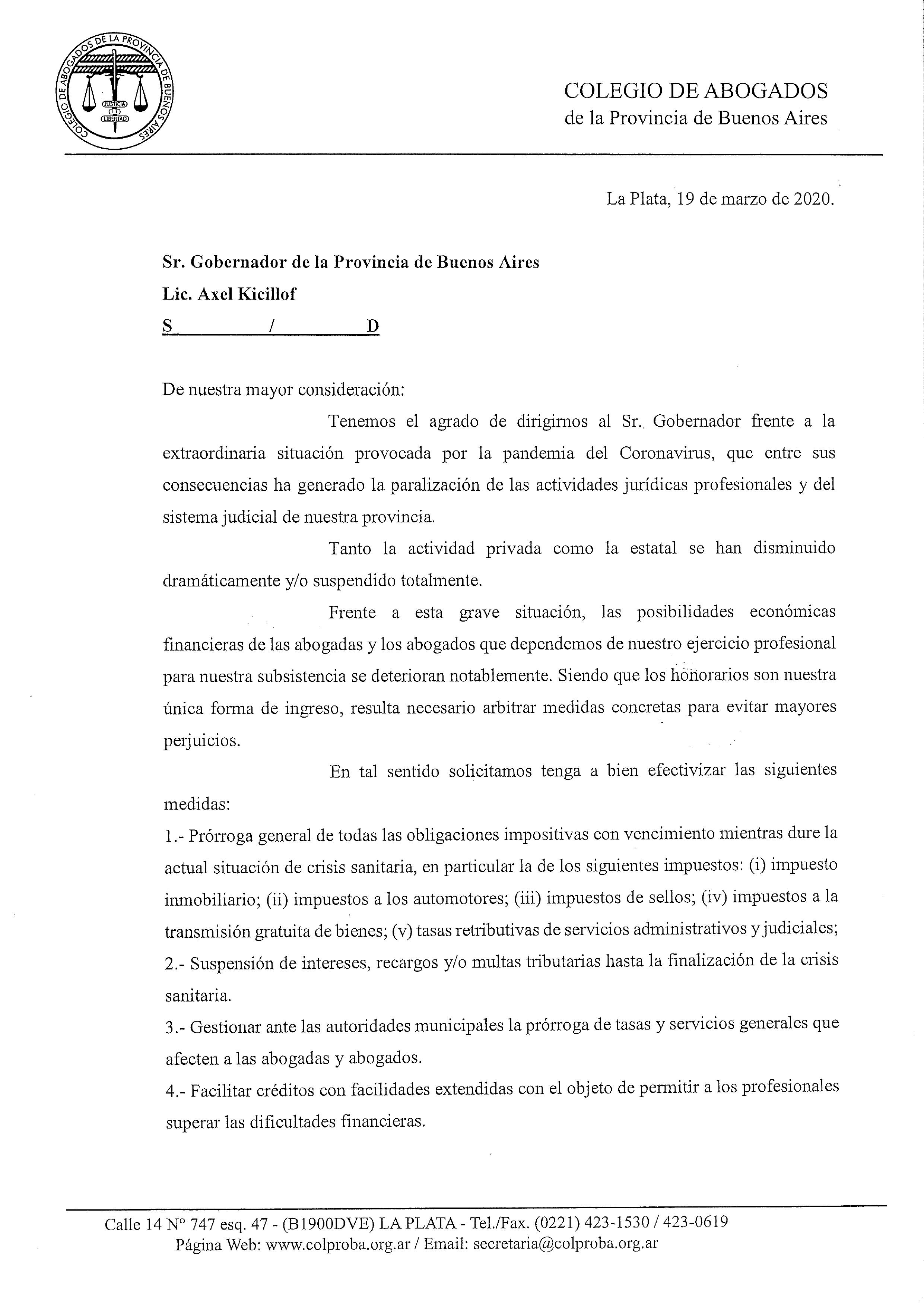 Frente a esta situación extraordinaria provocada por la pandemia del Coronavirus, que entre sus consecuencias ha generado la paralización de las actividades jurídicas profesionales y del sistema judicial de nuestra provincia; el COLPROBA pide al Gobernador Kicillof la prórroga de todas las obligaciones impositivas mientras dure la crisis.