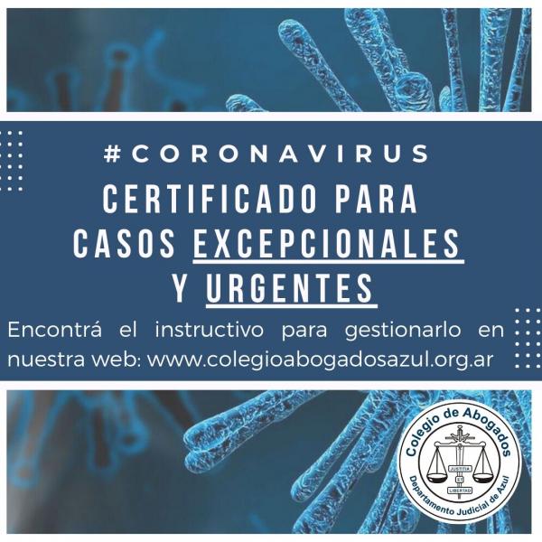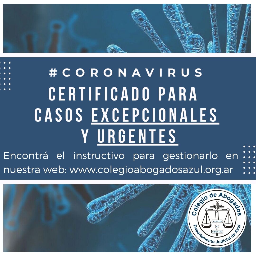 Cómo obtener el Certificado para las matriculadas y matriculados, que deban actuar en forma excepcional y urgente conforme la Resolución de la Mesa Directiva del Colegio de Abogados del Departamento Judicial de Azul, reunida en forma virtual el 22/3/2020 y que se transcribe a continuación.