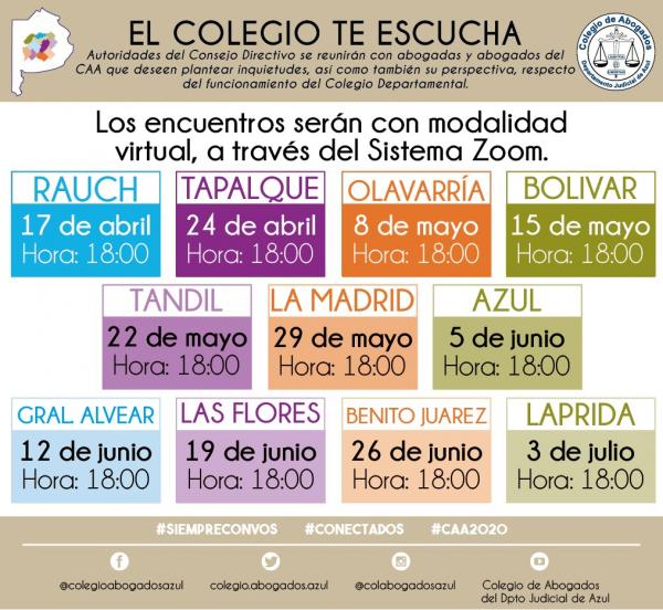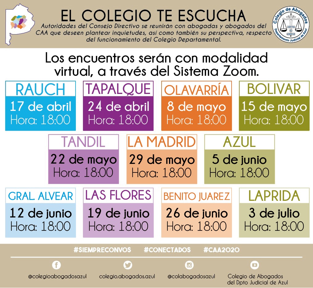 Durante este aislamiento social, preventivo y obligatorio queremos estar más cerca que nunca, atentos a tus necesidades e inquietudes; por eso a partir de este 17/04, todos los viernes a las 18hs autoridades del Consejo Directivo se reunirán en forma virtual (a través del sistema Zoom) con abogadas y abogados de los 11 Partidos del Departamento Judicial de Azul.