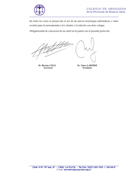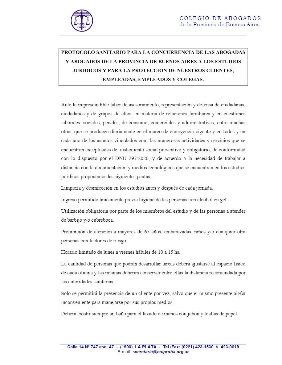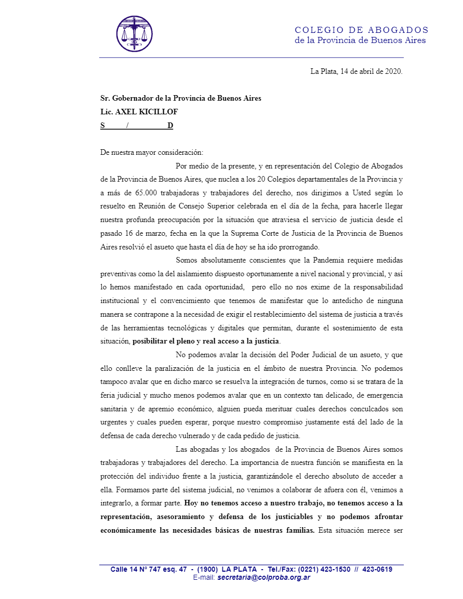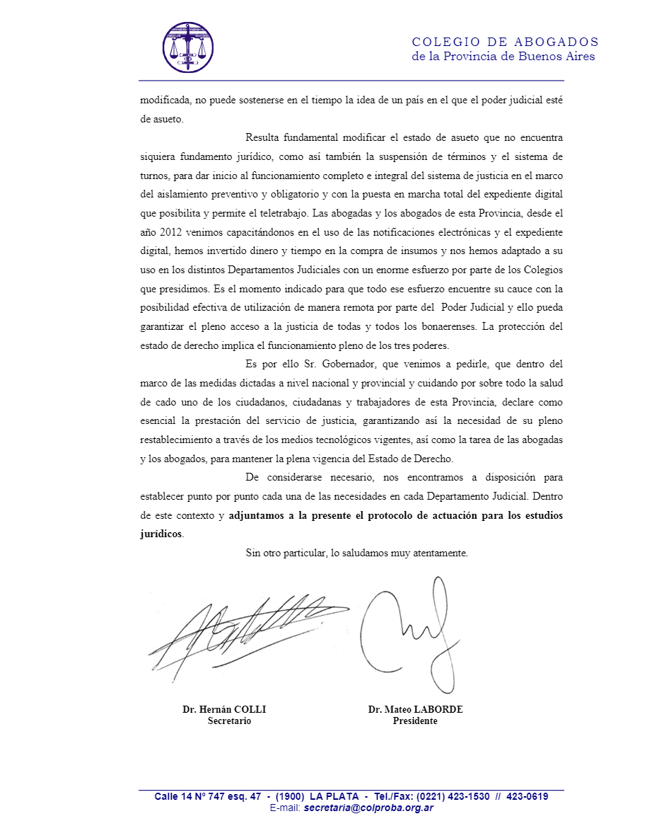La nota elevada al Gobernador Axel Kicillof fue acompañada por el protocolo de actuación para los estudios jurídicos, propuesto por el Colproba.