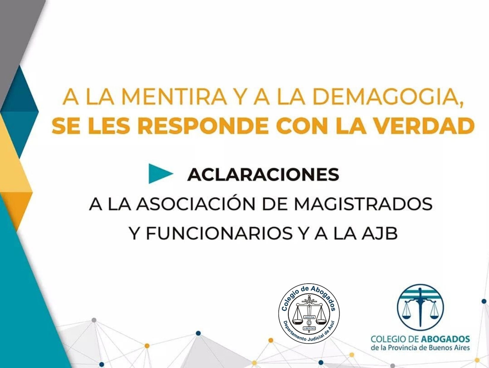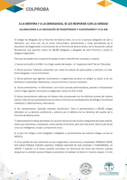 El Colegio de Abogados del Departamento Judicial de Azul adhiere y ratifica el comunicado del Colproba, que se ve en la penosa obligación de salir a desmentir, por única vez, los ya varios comunicados, declaraciones y notas periodísticas de la Asociación de Magistrados y Funcionarios de la Provincia de Buenos Aires y de la Asociación Judicial Bonaerense, que apuntan contra los 65.000 abogados y abogadas de esta Provincia y contra la abogacía organizada.