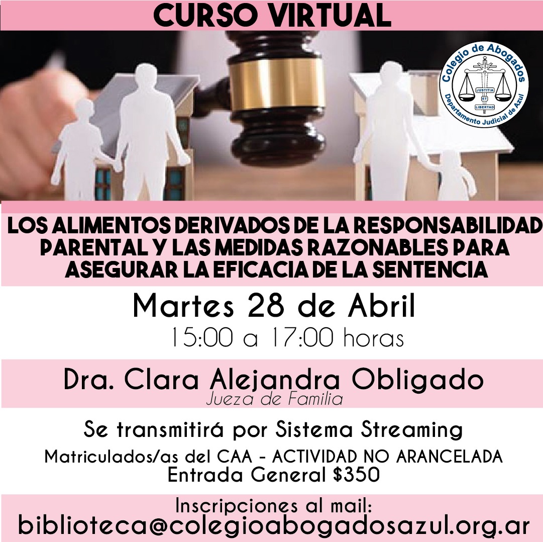 Este martes 28/04, de 15 a 17hs, la Dra. Clara Alejandra Obligado, Titular del Juzgado N° 5 de Familia de Mar del Plata, disertará sobre esta temática con modalidad virtual (vía streaming). Inscripciones. biblioteca@colegioabogadosazul.org.ar