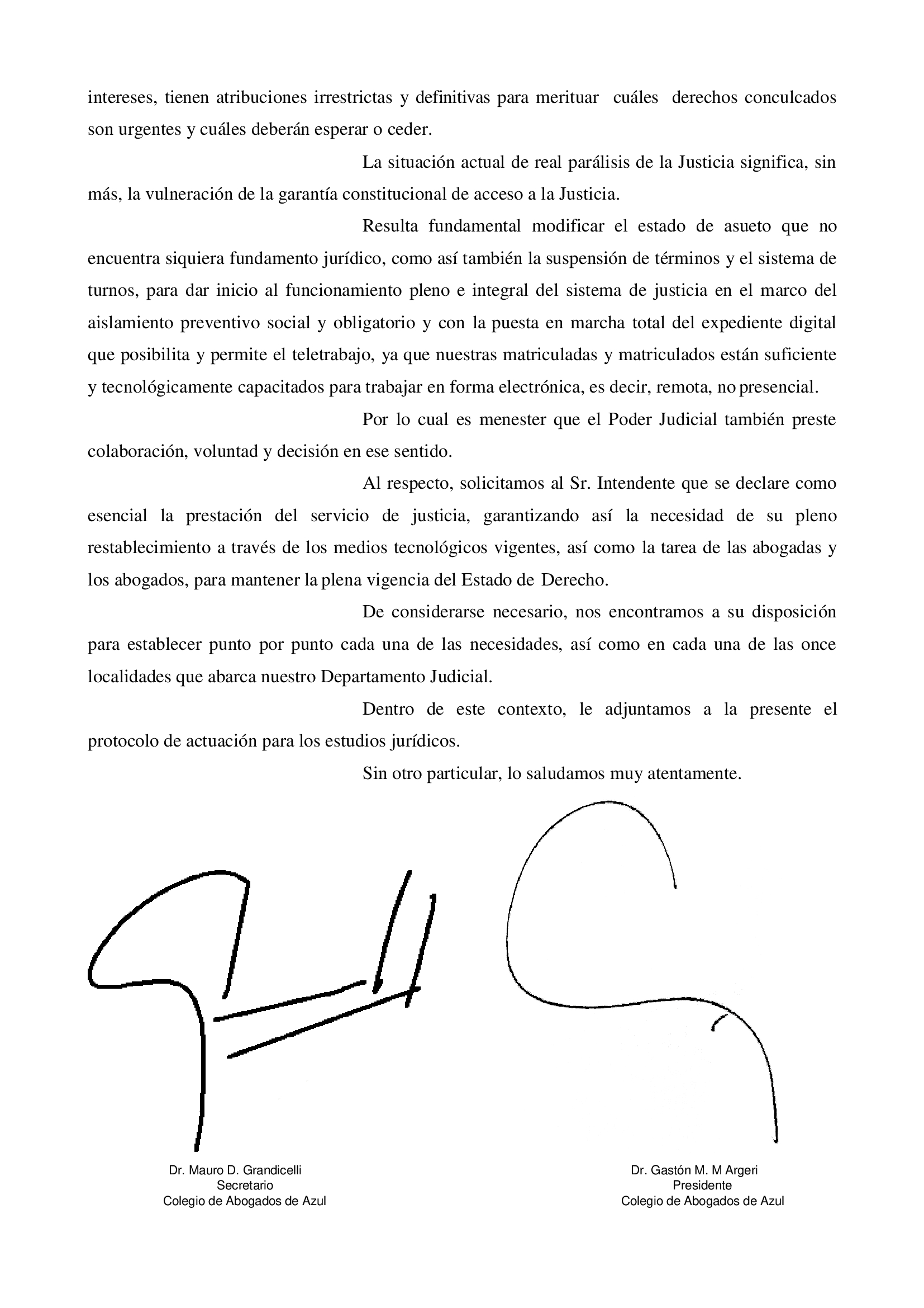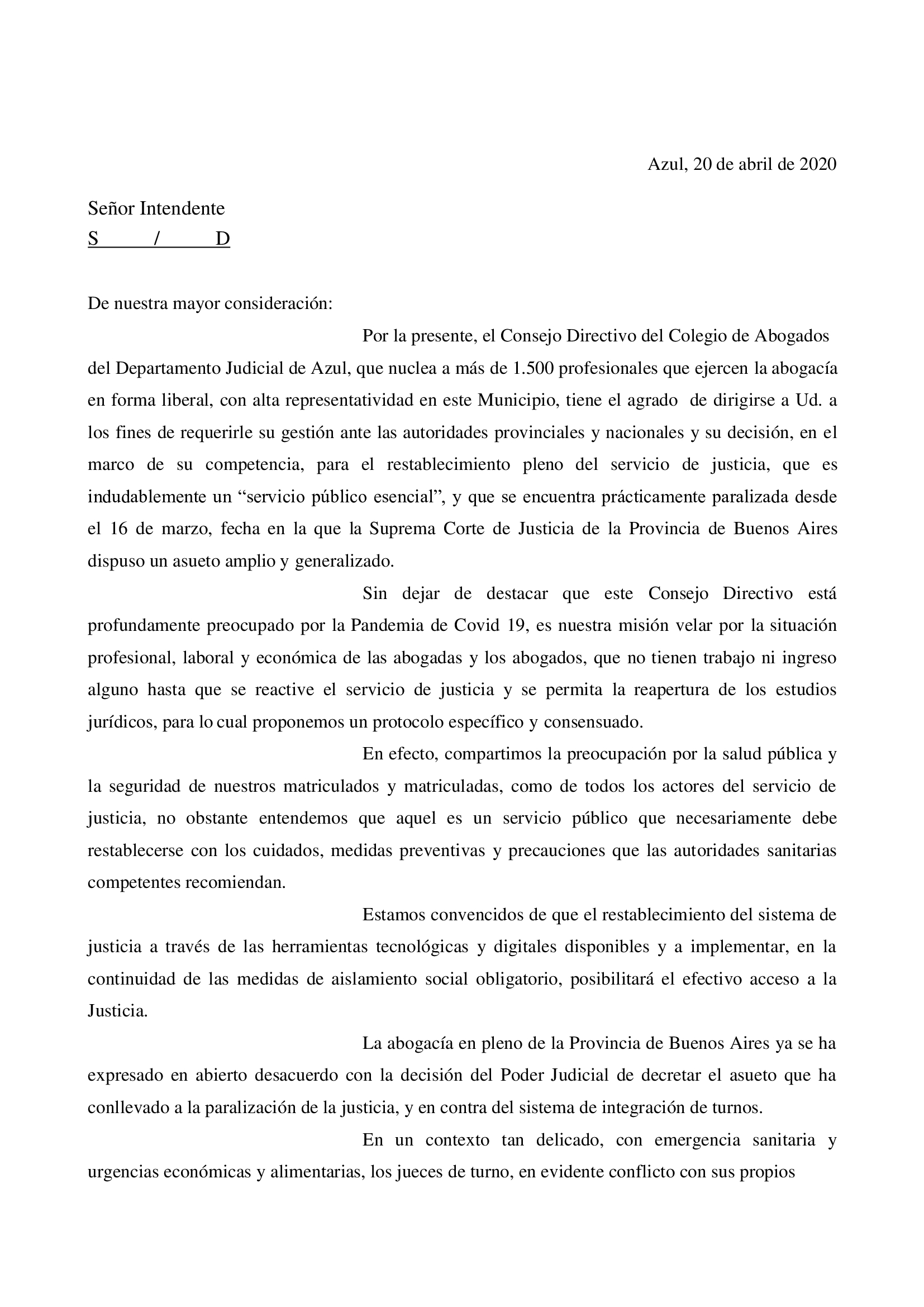 El Consejo Directivo del Colegio de Abogados Departamental realizó presentaciones ante los diferentes Municipios que integran el Colegio de Abogados del Departamento Judicial de Azul, a los fines de requerirle su gestión ante las autoridades provinciales y nacionales y su decisión, en el marco de su competencia, para el restablecimiento pleno del servicio de justicia, que es indudablemente un “servicio público esencial”, y que se encuentra prácticamente paralizada desde el 16 de marzo, fecha en la que la Suprema Corte de Justicia de la Provincia de Buenos Aires dispuso un asueto amplio y generalizado.