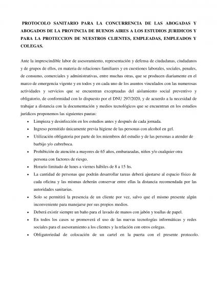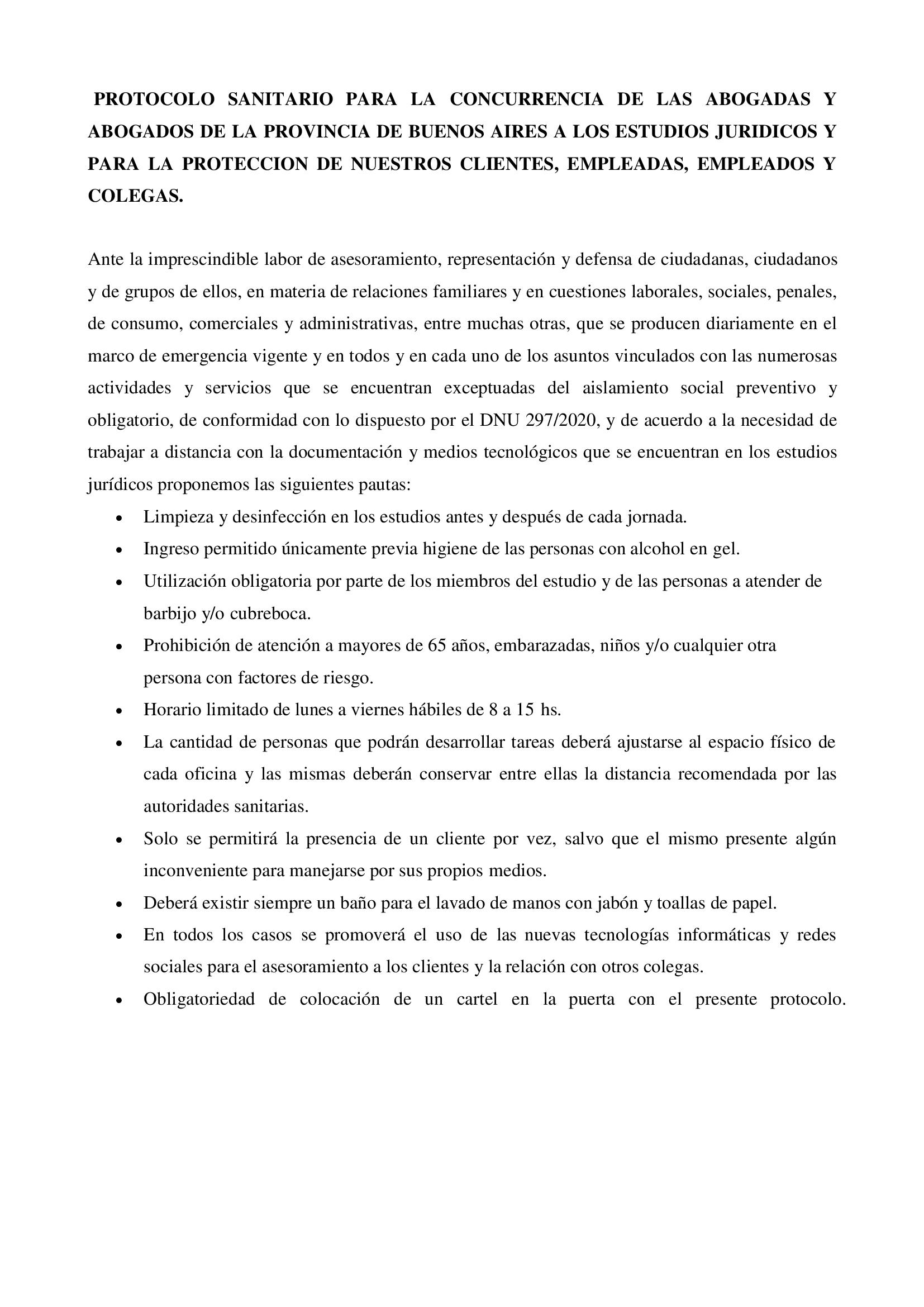 Sin dejar de destacar que este Consejo Directivo está profundamente preocupado por la Pandemia de Covid 19, es nuestra misión velar por la situación profesional, laboral y económica de las abogadas y los abogados, que no tienen trabajo ni ingreso alguno hasta que se reactive el servicio de justicia y se permita la reapertura de los estudios jurídicos, para lo cual proponemos un protocolo específico y consensuado.