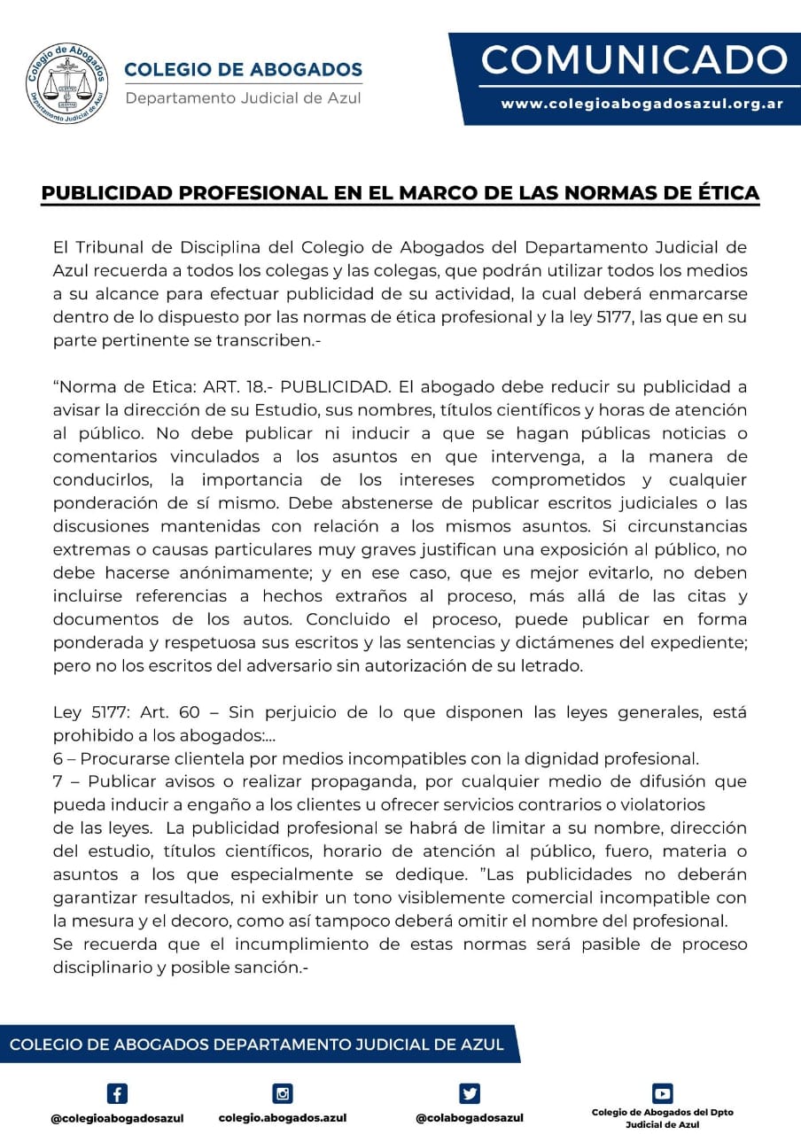 El Tribunal de Disciplina recuerda a todos los colegas y las colegas, que podrán utilizar todos los medios a su alcance para efectuar publicidad de su actividad, la cual deberá enmarcarse dentro de lo dispuesto por las normas de ética profesional y la ley 5177, las que en su parte pertinente se transcriben.