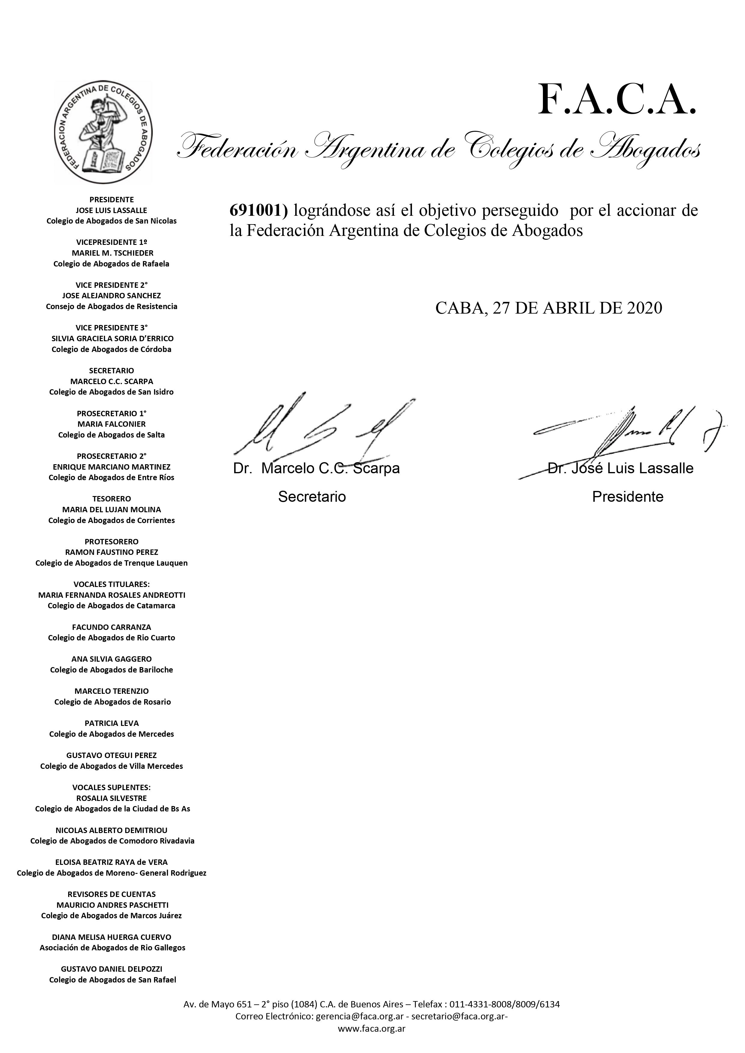 La Federación Argentina de Colegios de Abogados peticionó en representación de los 82 colegios y asociaciones que la integran, a fin de que la abogacía (servicios jurídicos) sea incluida dentro del listado de actividades afectadas en forma crítica a raíz de la propagación del coronavirus conocido como COVID-19, lo que había sido omitido en el listado emitido por la AFIP anexo a la Resolución General 4693/2020.