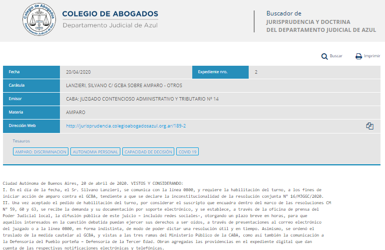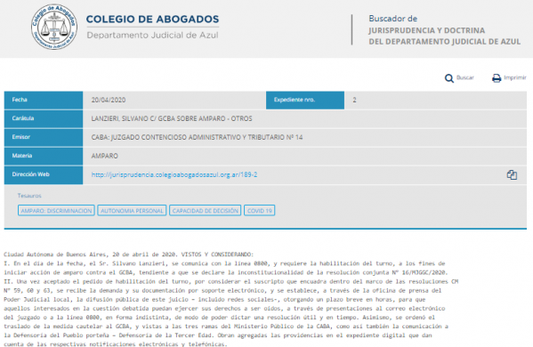 En fecha 20 de abril de 2020, el Juzgado en lo Contencioso Administrativo y Tributario de la Ciudad Autónoma de Buenos Aires en los autos " LANZIERI, SILVANO CONTRA GCBA SOBRE AMPARO - OTROS" Número: EXP 3045/2020-0, declarar la inconstitucionalidad de los arts. 2° y 3° de la resolución conjunta MSJGM N° 16/2020, por que importa una discriminación en razón de la edad, que vulnera los derechos y las garantías del grupo etario al cual se encuentra destinada, al imponer una exigencia mayor y distintiva del resto de la población.