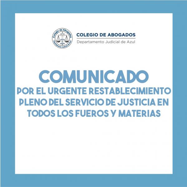 Habiendo transcurrido casi 60 días en contexto de excepción, período en el cual se ha avanzado en el control de la curva de contagios por COVID-19, y siendo que el pasado 27 de abril se ha ingresado en la etapa de cuarentena segmentada, el Estado de Derecho y el Sistema Republicano requieren imperiosamente que la Suprema Corte de Justicia de la Provincia de Buenos Aires de manera URGENTE DISPONGA EL RESTABLECIMIENTO PLENO DEL SERVICIO DE JUSTICIA EN TODOS LOS FUEROS Y MATERIAS en favor de los bonaerenses. Para ello deberán adoptarse las medidas y/o mecanismos de excepción que fueren necesarios para garantizar, inclusive, las instancias procesales que requieran actividad presencial, bajo estrictas medidas de prevención sanitaria que deberá disponer la misma S.C.B.A.-
