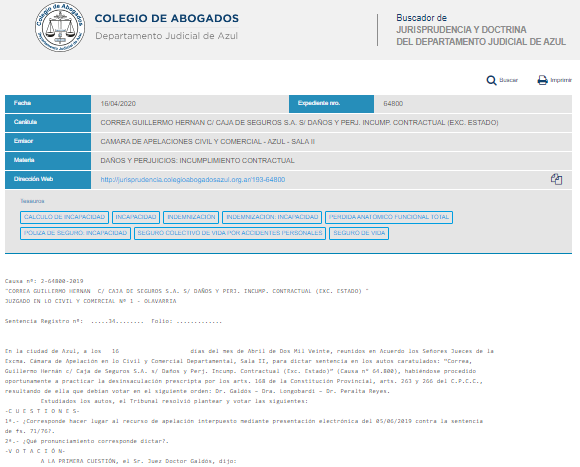 Con fecha 16 de abril de 2020, la Sala II de la Excma. Cámara de Apelación en lo Civil y comercial de Azul dictó sentencia en la causa “Correa, Guillermo Hernán c/ Caja de Seguros S.A. s/ Daños y Perj. Incump. Contractual (Exc. Estado)” (Causa n° 64.800) en materia de indemnización de seguro colectivo de vida por accidentes personales.