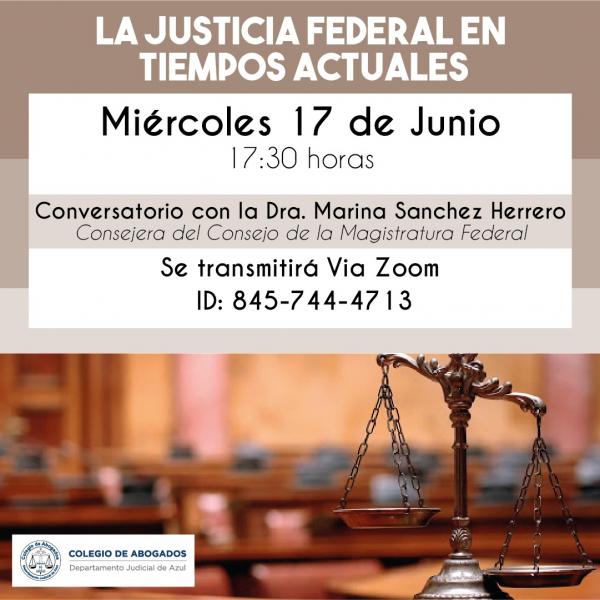 Miércoles 17 de Junio de 2020. Hoy: Conversatorio “La Justicia Federal en los tiempos actuales”. La Dra. Marina Sánchez Herrero, Consejera del Consejo de la Magistratura Federal abordará esta temática, el miércoles 17 barra 06 desde las .17 30 horas, vía Zoom. Podrás participar utilizando el ID 845 744 .4713  .