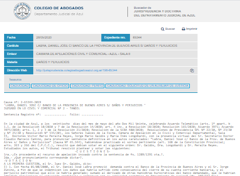 Con fecha 28 de mayo de 2020, la Cámara Civil y Comercial (Sala II) de Azul, en la causa nº 65.344, "Labra, Daniel José c/ Banco de la Provincia de Buenos Aires s/ daños y perjuicios ", confirmó la caducidad de instancia que, aunque pedida por un perito fue decretada de oficio.