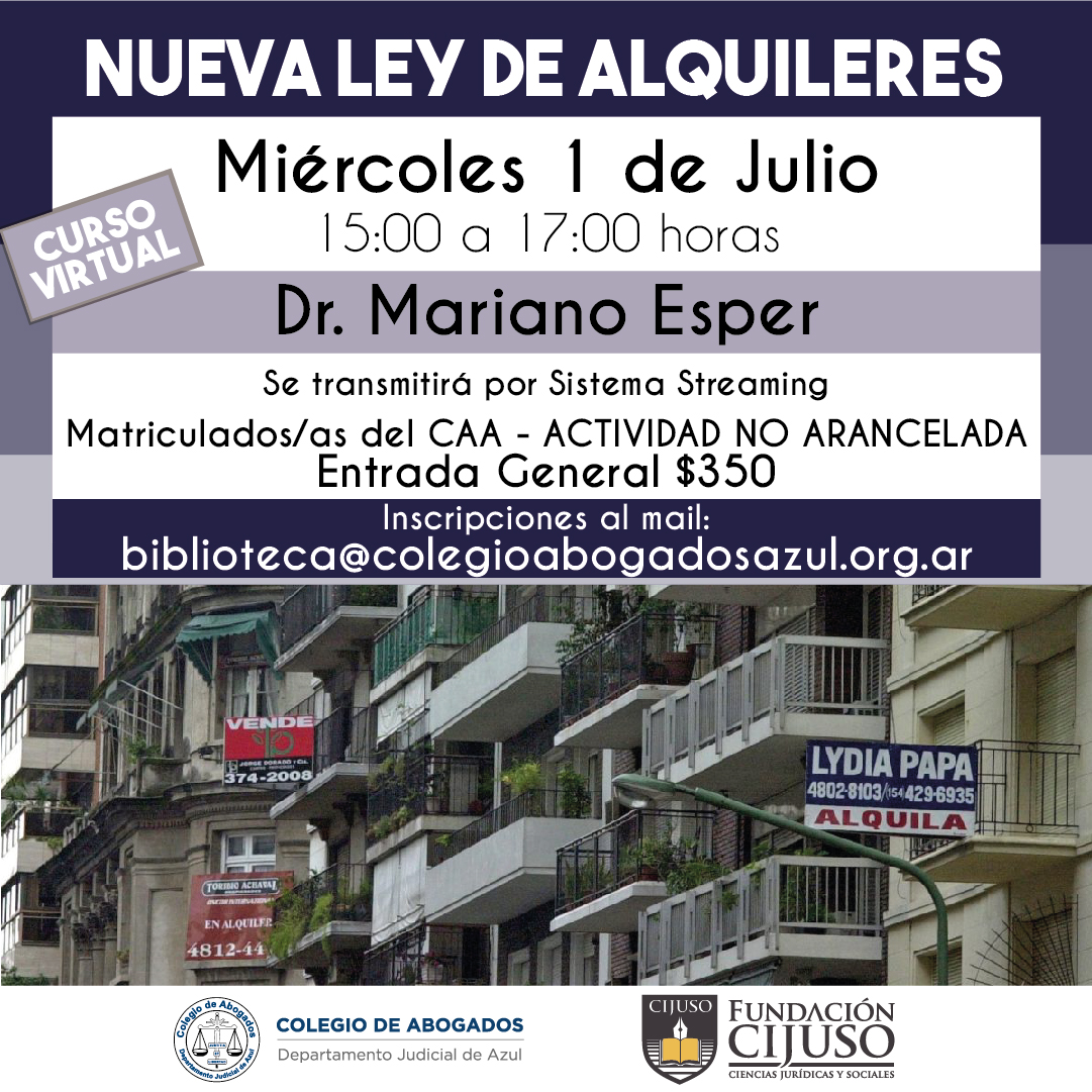 El miércoles 1 de Julio de 15 a 17hs, el Dr. Mariano Esper brindará esta capacitación organizada por Fundación CIJUSO y el Colegio de Abogados Departamental. Se realizará vía streaming y se entregarán certificados de asistencia. Inscripciones: biblioteca@colegioabogadosazul.org.ar