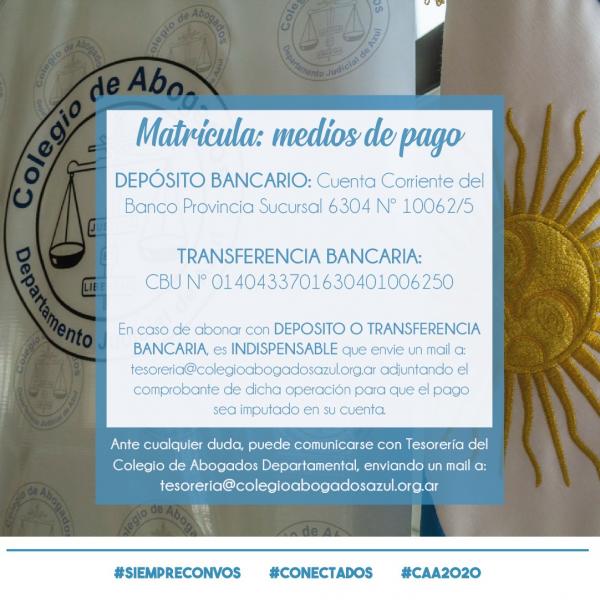 En caso de abonar con DEPÓSITO o TRANSFERENCIA BANCARIA, es INDISPENSABLE que envíe un mail a: tesoreria@colegioabogadosazul.org.ar adjuntando el comprobante de dicha operación para que el pago sea imputado en su cuenta.