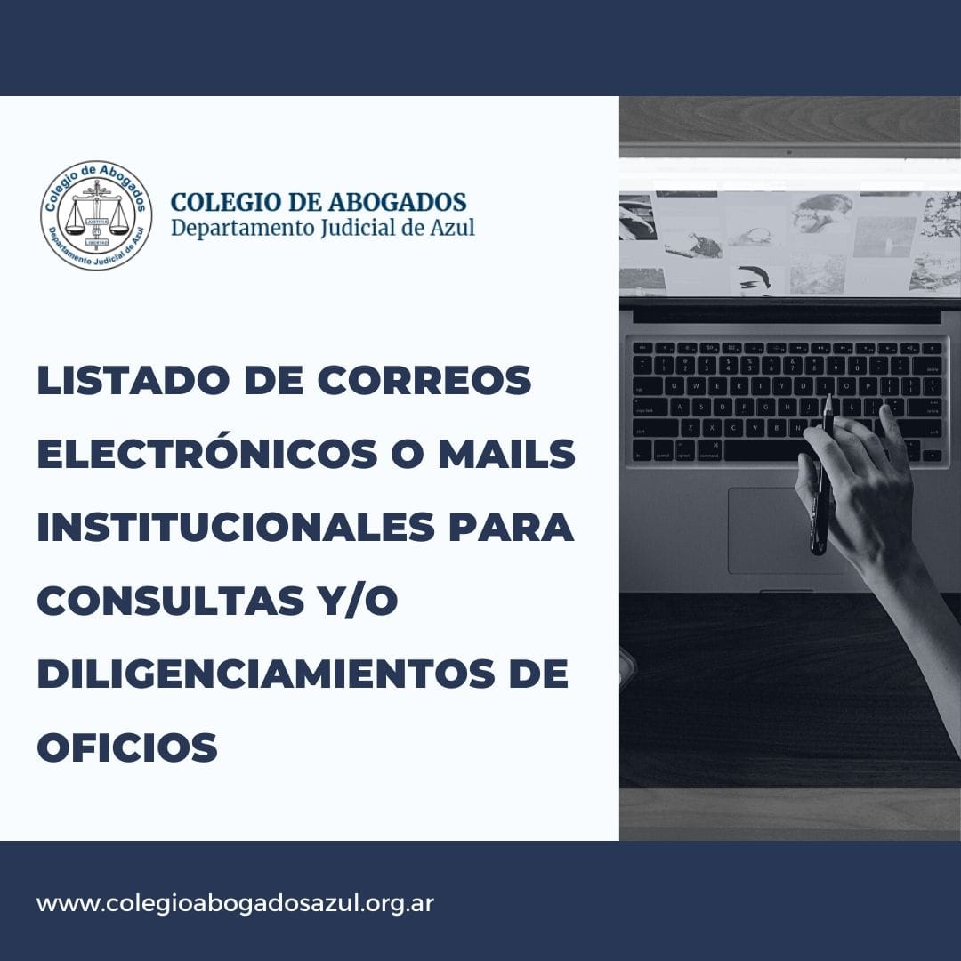De conocer otros correos electrónicos de cualquier organismo, empresa, institución, etc., no duden en informarnos a secretaria@colegioabogadosazul.org.ar, lo cual nos permitirá contar con una lista más completa y práctica.