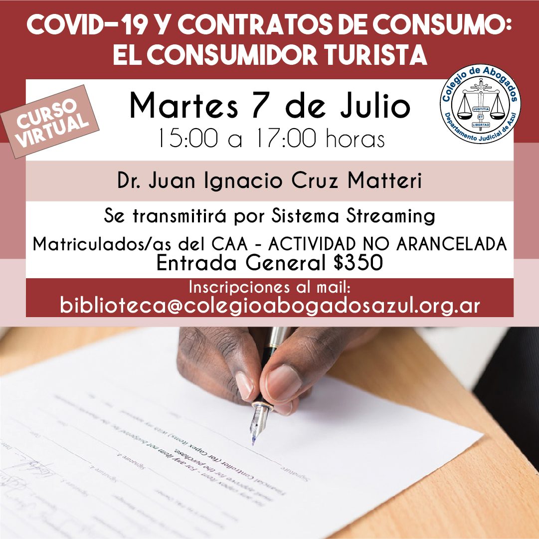 El Dr. Juan Ignacio Cruz Matteri, destadcado especialista, disertará sobre esta temática el martes 7 de julio de 15 a 17hs, vía streaming. Se entregarán certificados de asistencia. Inscripciones: biblioteca@colegioabogadosazul.org.ar